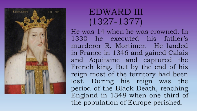 executed his father’s murderer R. Mortimer. He landed in France in 1346 and gained Calais and Aquitaine and captured the French king. But by the end of his reign most of the territory had been lost. During his reign was the period of the Black Death, reaching England in 1348 when one third of the population of Europe perished.