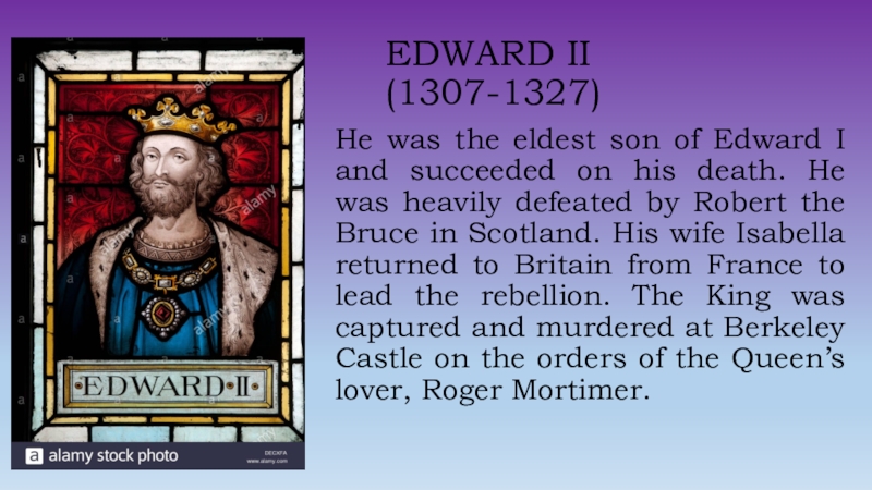 EDWARD II (1307-1327)He was the eldest son of Edward I and succeeded on his death. He was