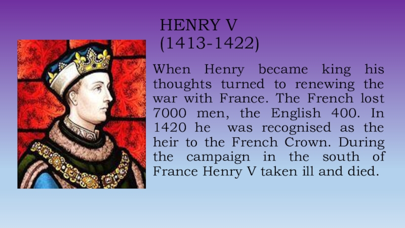 war with France. The French lost 7000 men, the English 400. In 1420 he was recognised as the heir to the French Crown. During the campaign in the south of France Henry V taken ill and died.