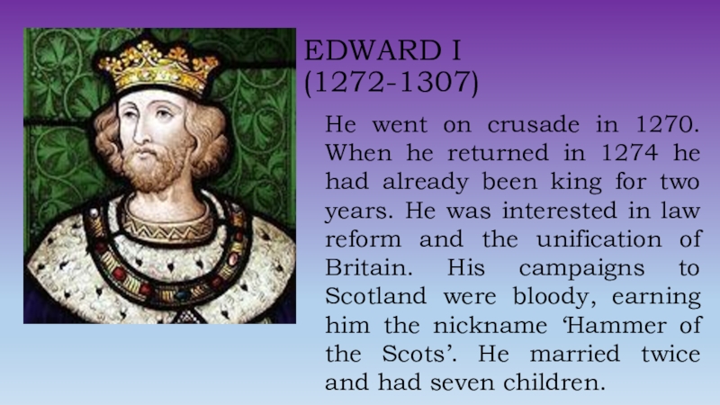 1274 he had already been king for two years. He was interested in law reform and the unification of Britain. His campaigns to Scotland were bloody, earning him the nickname ‘Hammer of the Scots’. He married twice and had seven children.