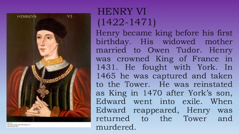 HENRY VI  (1422-1471)Henry became king before his first birthday. His widowed mother married to Owen Tudor.