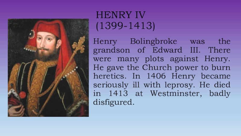 many plots against Henry. He gave the Church power to burn heretics. In 1406 Henry became seriously ill with leprosy. He died in 1413 at Westminster, badly disfigured.