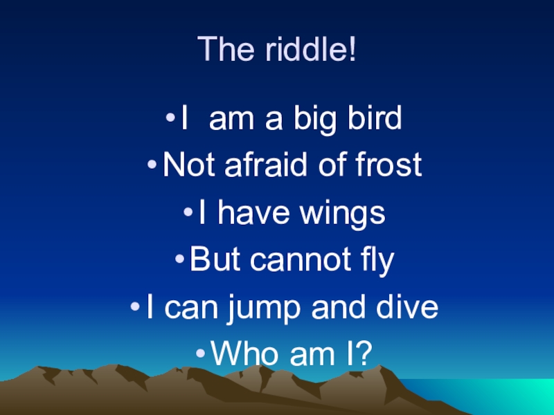 The riddle!I am a big bird Not afraid of frostI have wingsBut cannot flyI can jump and