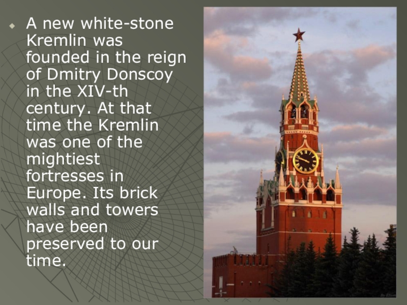 A new white-stone Kremlin was founded in the reign of Dmitry Donscoy in the XIV-th century. At