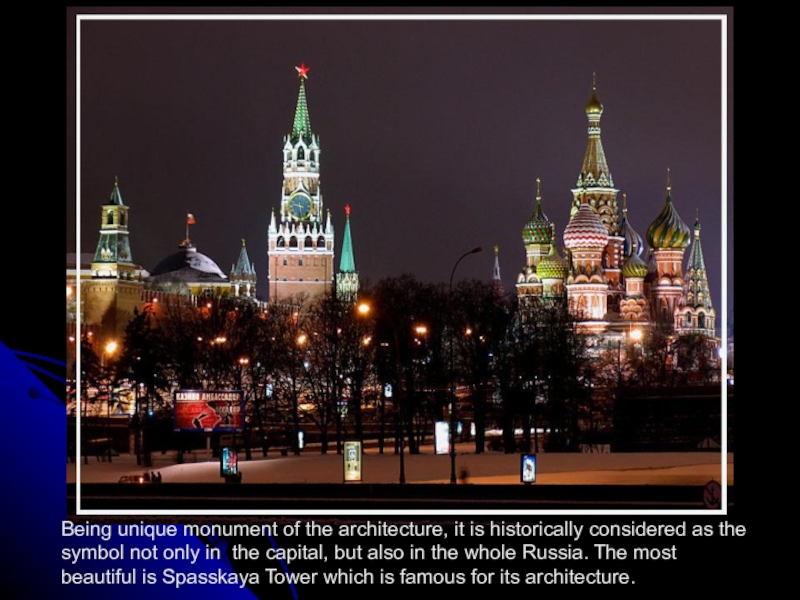 the symbol not only in the capital, but also in the whole Russia. The most beautiful is Spasskaya Tower which is famous for its architecture.