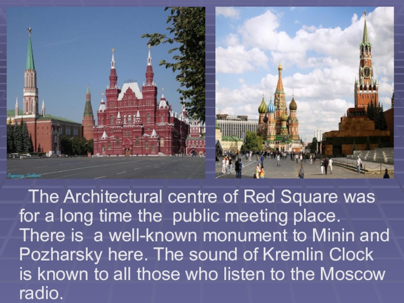 a long time the public meeting place. There is a well-known monument to Minin and Pozharsky here. The sound of Kremlin Clock is known to all those who listen to the Moscow radio.