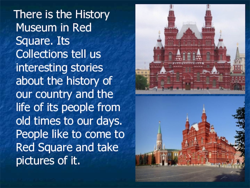 tell us interesting stories about the history of our country and the life of its people from old times to our days. People like to come to Red Square and take pictures of it.