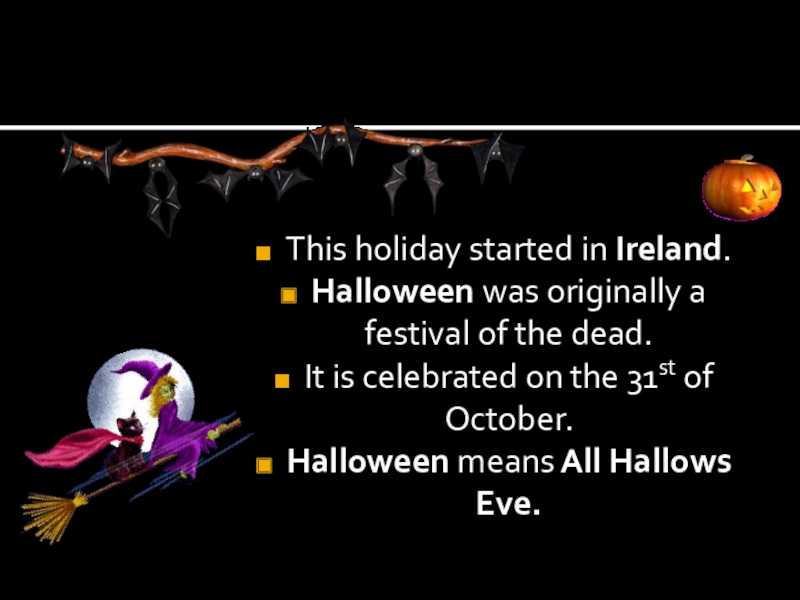 This holiday started in Ireland. Halloween was originally a festival of the dead. It is celebrated on the 31st of October. Halloween means All Hallows Eve.