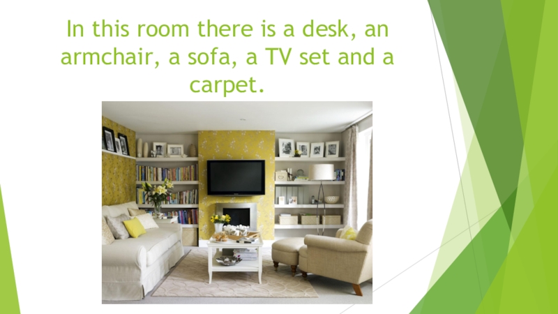 Слайд 3In this room there is a desk, an armchair, a sofa,