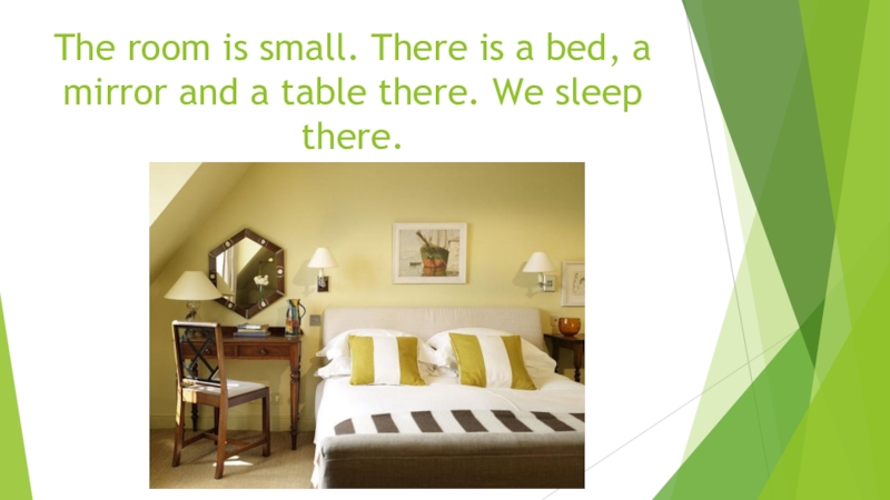 The room is small. There is a bed, a mirror and a table there. We sleep there.
