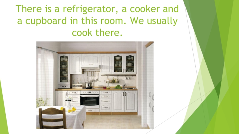 Слайд 6There is a refrigerator, a cooker and a cupboard in this