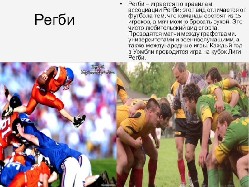 футбола тем, что команды состоят из 15 игроков, а мяч можно бросать рукой. Это чисто любительский вид спорта. Проводятся матчи между графствами, университетами и военнослужащими, а также международные игры. Каждый год в Уэмбли проводится игра на кубок Лиги Регби.