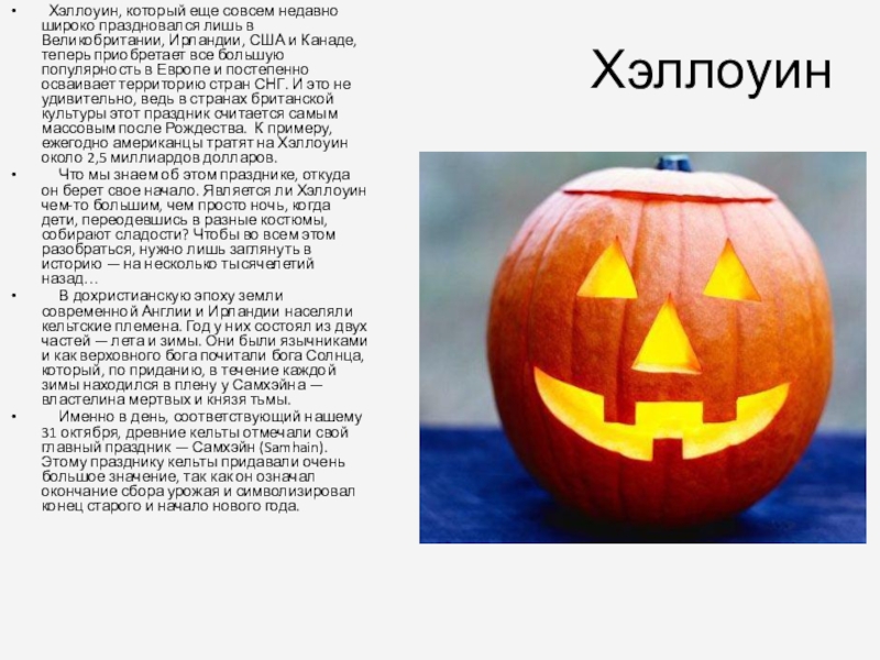 Великобритании, Ирландии, США и Канаде, теперь приобретает все большую популярность в Европе и постепенно осваивает территорию стран СНГ. И это не удивительно, ведь в странах британской культуры этот праздник считается самым массовым после Рождества. К примеру, ежегодно американцы тратят на Хэллоуин около 2,5 миллиардов долларов.