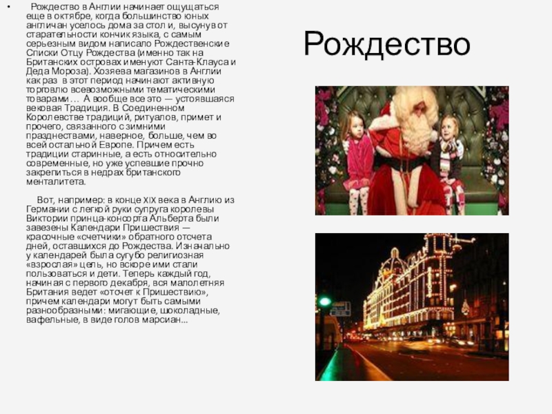 юных англичан уселось дома за стол и, высунув от старательности кончик языка, с самым серьезным видом написало Рождественские Списки Отцу Рождества (именно так на Британских островах именуют Санта-Клауса и Деда Мороза). Хозяева магазинов в Англии как раз в этот период начинают активную торговлю всевозможными тематическими товарами… А вообще все это — устоявшаяся вековая Традиция. В Соединенном Королевстве традиций, ритуалов, примет и прочего, связанного с зимними празднествами, наверное, больше, чем во всей остальной Европе. Причем есть традиции старинные, а есть относительно современные, но уже успевшие прочно закрепиться в недрах британского менталитета.