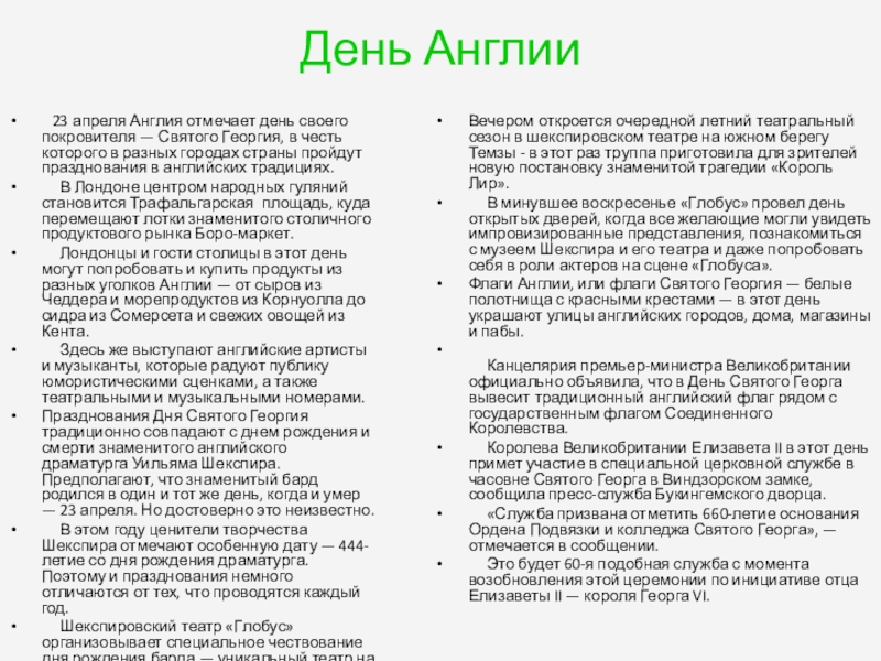 Флаги Англии, или флаги Святого Георгия — белые полотнища с красными крестами — в этот день украшают улицы английских городов, дома, магазины и пабы.