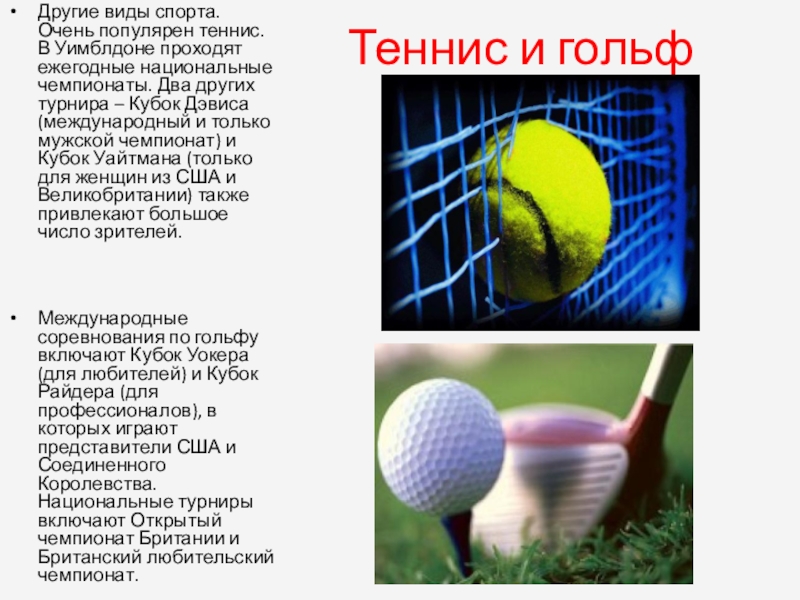 Другие виды спорта. Очень популярен теннис. В Уимблдоне проходят