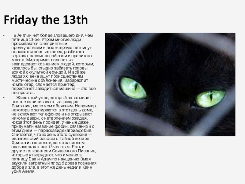 Животный ужас, который охватывает вполне цивилизованных граждан Британии, мало чем объясним. Например, некоторые запираются в этот день дома, не включают телефонов и не открывают никому двери, с нетерпением ожидая, когда этот день пройдет. Ученые даже придумали название фобии, связанной с этим днем — параскавидекатриафобия. Считается, что корень этого суеверия — евангельский рассказ о Тайной вечере Христа и апостолов, когда за столом оказались как раз 13 человек. Есть и другие толкователи Священного Писания, которые утверждают, что именно в пятницу Ева и Адам по наущению Змея вкусили запретный плод с древа познания добра и зла, в этот же день недели Каин убил Авеля.