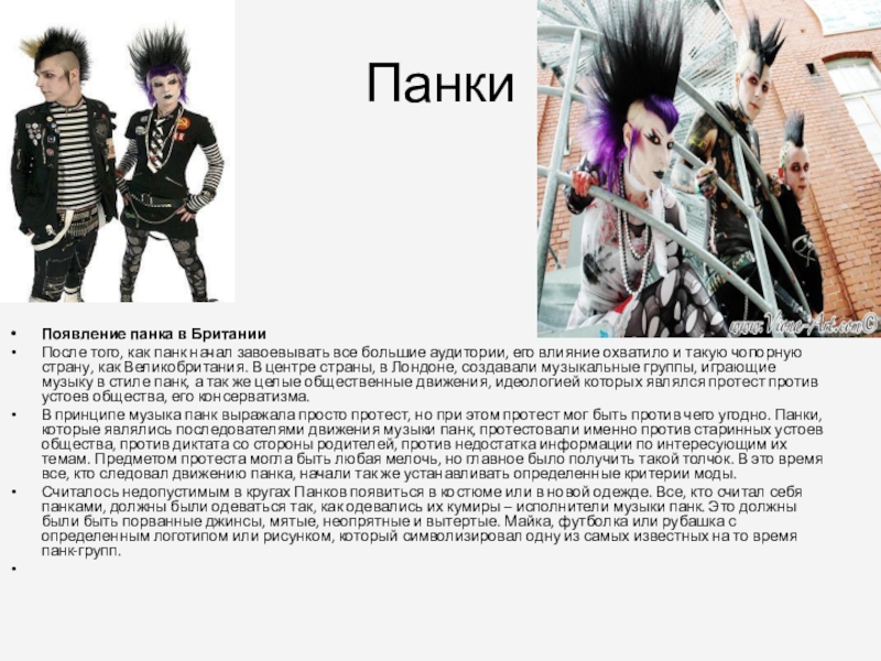 аудитории, его влияние охватило и такую чопорную страну, как Великобритания. В центре страны, в Лондоне, создавали музыкальные группы, играющие музыку в стиле панк, а так же целые общественные движения, идеологией которых являлся протест против устоев общества, его консерватизма.