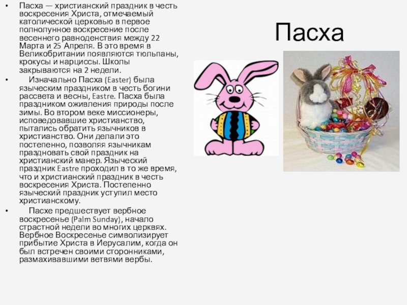 Изначально Пасха (Easter) была языческим праздником в честь богини рассвета и весны, Eastre. Пасха была праздником оживления природы после зимы. Во втором веке миссионеры, исповедовавшие христианство, пытались обратить язычников в христианство. Они делали это постепенно, позволяя язычникам праздновать свой праздник на христианский манер. Языческий праздник Eastre проходил в то же время, что и христианский праздник в честь воскресения Христа. Постепенно языческий праздник уступил место христианскому.