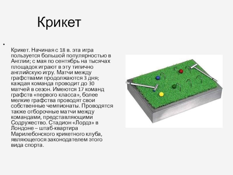 Англии; с мая по сентябрь на тысячах площадок играют в эту типично английскую игру. Матчи между графствами продолжаются 3 дня; каждая команда проводит до 30 матчей в сезон. Имеются 17 команд графств «первого класса», более мелкие графства проводят свои собственные чемпионаты. Проводятся также отборочные матчи между командами, представляющими Содружество. Стадион «Лордз» в Лондоне – штаб-квартира Марилебонского крикетного клуба, являющегося законодателем этого вида спорта.