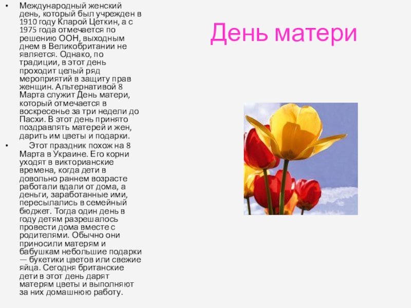 Цеткин, а с 1975 года отмечается по решению ООН, выходным днем в Великобритании не является. Однако, по традиции, в этот день проходит целый ряд мероприятий в защиту прав женщин. Альтернативой 8 Марта служит День матери, который отмечается в воскресенье за три недели до Пасхи. В этот день принято поздравлять матерей и жен, дарить им цветы и подарки.