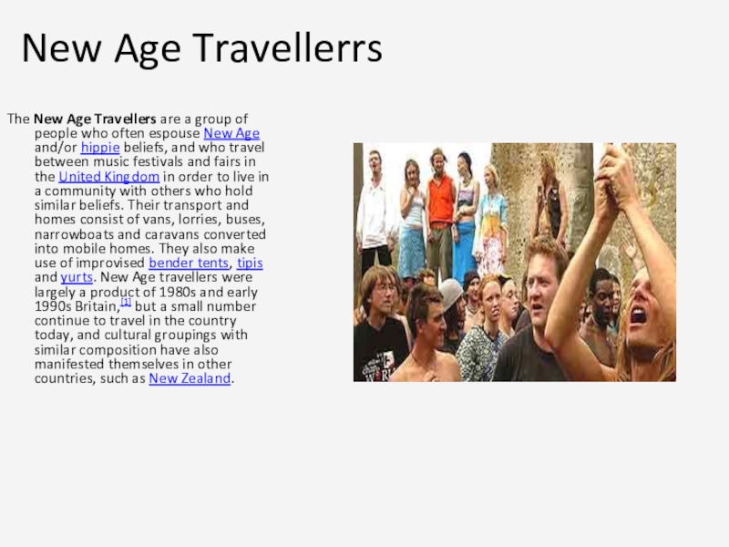 who often espouse New Age and/or hippie beliefs, and who travel between music festivals and fairs in the United Kingdom in order to live in a community with others who hold similar beliefs. Their transport and homes consist of vans, lorries, buses, narrowboats and caravans converted into mobile homes. They also make use of improvised bender tents, tipis and yurts. New Age travellers were largely a product of 1980s and early 1990s Britain,[1] but a small number continue to travel in the country today, and cultural groupings with similar composition have also manifested themselves in other countries, such as New Zealand.