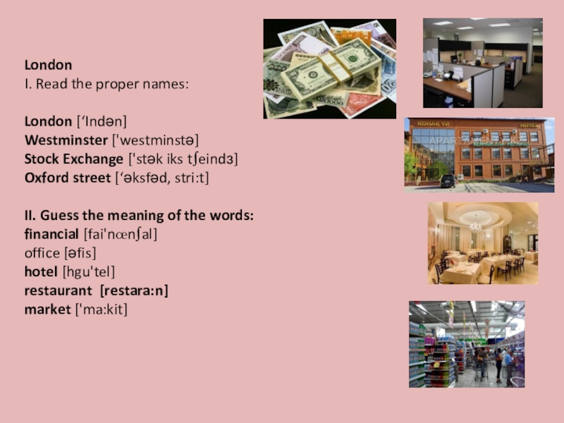 LondonI. Read the proper names:London [‘Indәn] Westminster ['westminstә]Stock Exchange ['stәk iks t∫eindз] Oxford street [‘әksfәd, stri:t]II. Guess