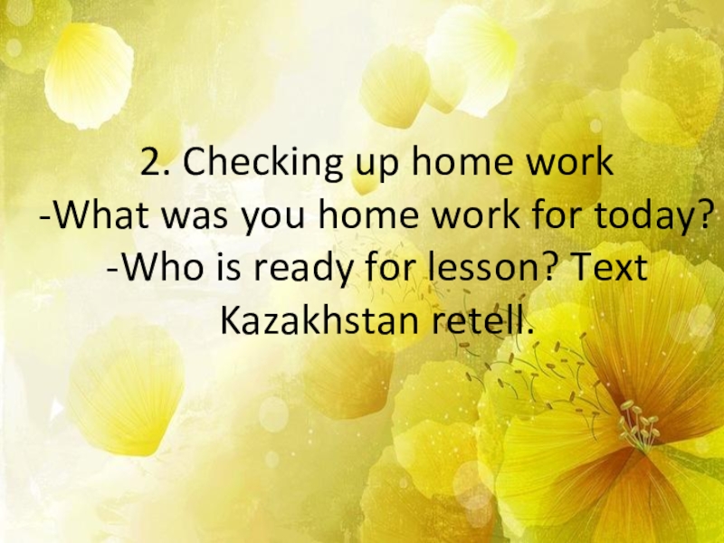 2. Checking up home work -What was you home work for today? -Who is ready for lesson?