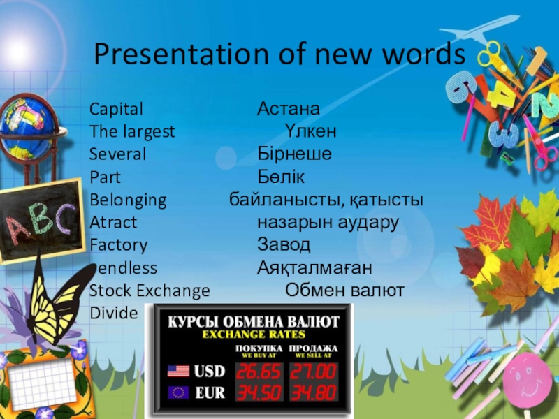 Presentation of new wordsCapital  				Астана The largest    			Үлкен Several 				Бірнеше Part 					Бөлік Belonging