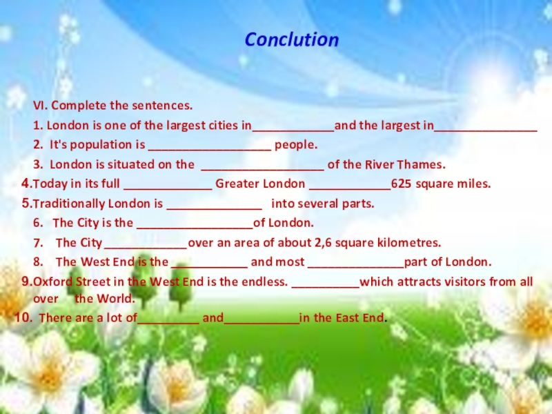 ConclutionVI. Complete the sentences.1. London is one of the largest cities in____________and the largest in_______________2. It's population