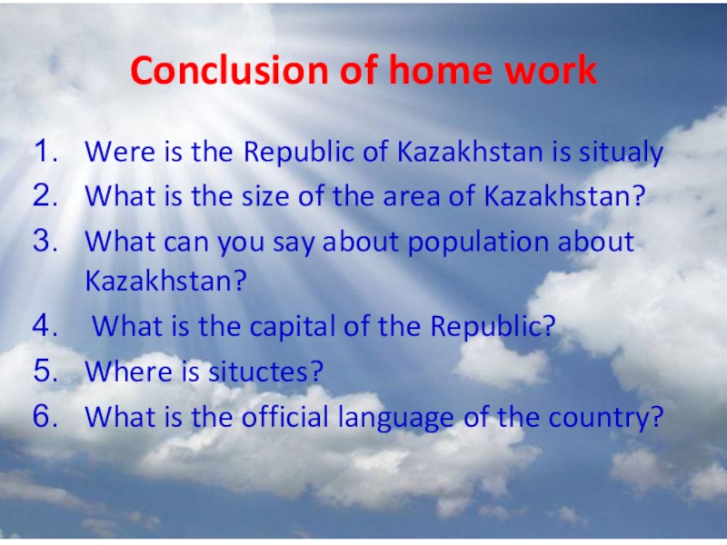 Conclusion of home workWere is the Republic of Kazakhstan is situalyWhat is the size of the area