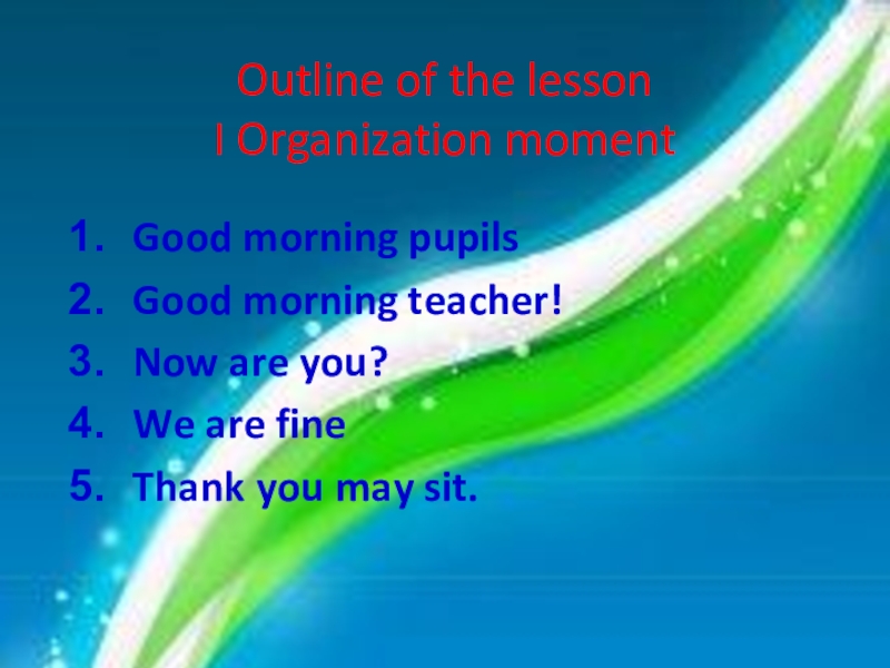 Outline of the lesson I Organization momentGood morning pupilsGood morning teacher!Now are you?We are fine Thank you