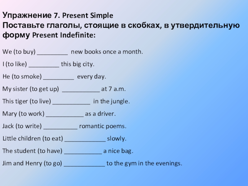 Упражнение 7. Present SimpleПоставьте глаголы, стоящие в скобках, в утвердительную форму Present Indefinite:We (to buy) _________ new