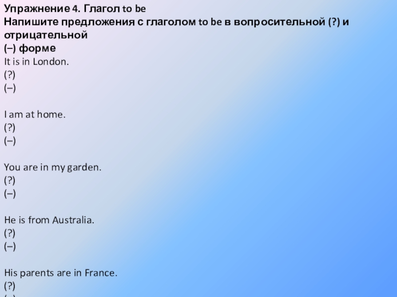 Упражнение 4. Глагол to beНапишите предложения с глаголом to be в вопросительной (?) и отрицательной (–) формеIt