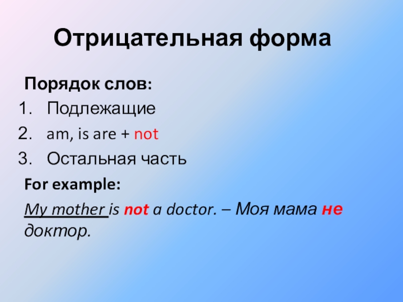 Отрицательная форма Порядок слов: Подлежащиеam, is are + notОстальная часть For example: My mother is not a