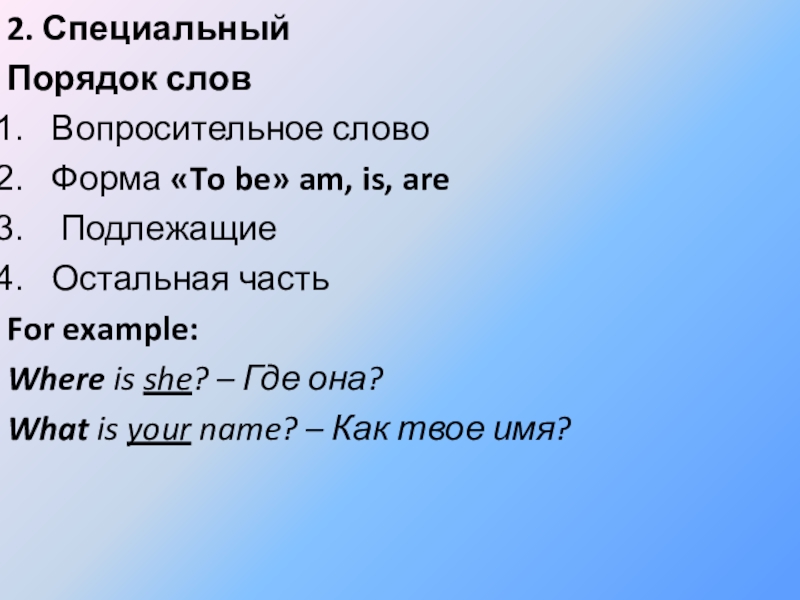 2. Специальный Порядок словВопросительное слово Форма «To be» am, is, are Подлежащие Остальная часть For example: Where