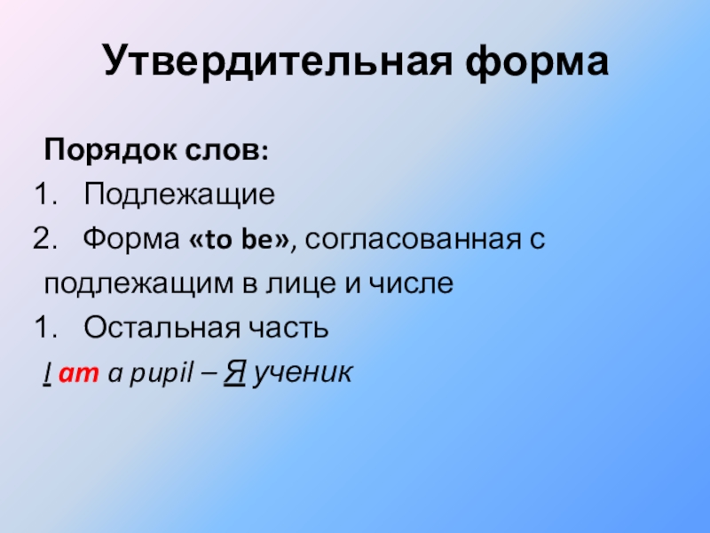 Утвердительная форма Порядок слов:Подлежащие Форма «to be», согласованная сподлежащим в лице и числе Остальная часть I am