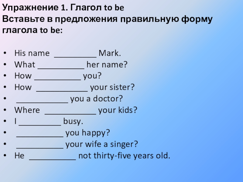 Упражнение 1. Глагол to beВставьте в предложения правильную форму глагола to be: His name _________ Mark.What __________