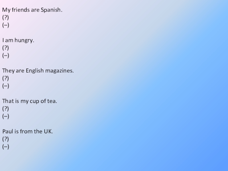 My friends are Spanish.(?) (–) I am hungry.(?) (–) They are English magazines.(?) (–) That is my