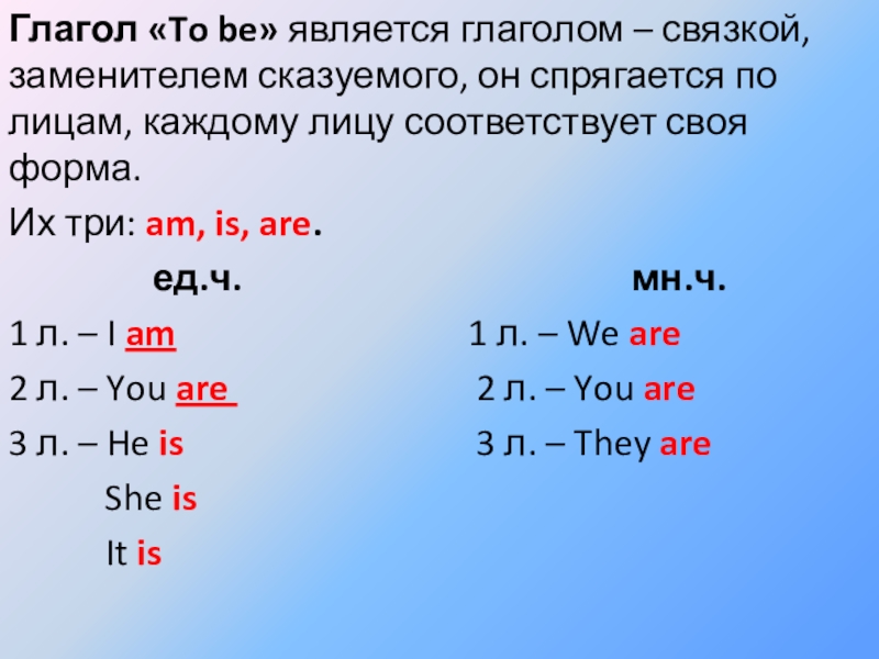 Глагол «To be» является глаголом – связкой, заменителем сказуемого, он спрягается по лицам, каждому лицу соответствует своя форма.Их три: am, is, are.ед.ч.