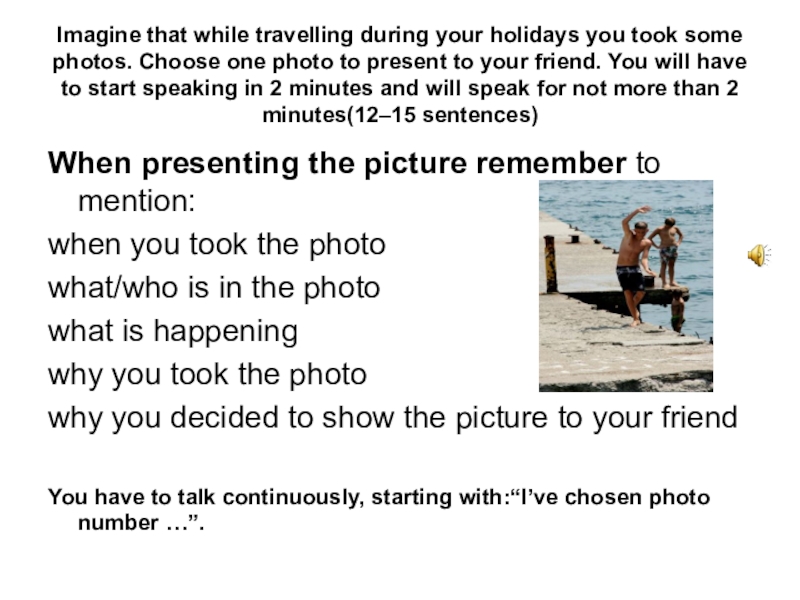 Слайд 45Imagine that while travelling during your holidays you took some photos.