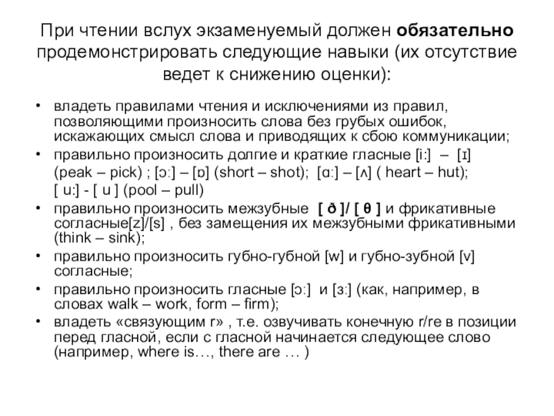 Слайд 8При чтении вслух экзаменуемый должен обязательно продемонстрировать следующие навыки (их отсутствие