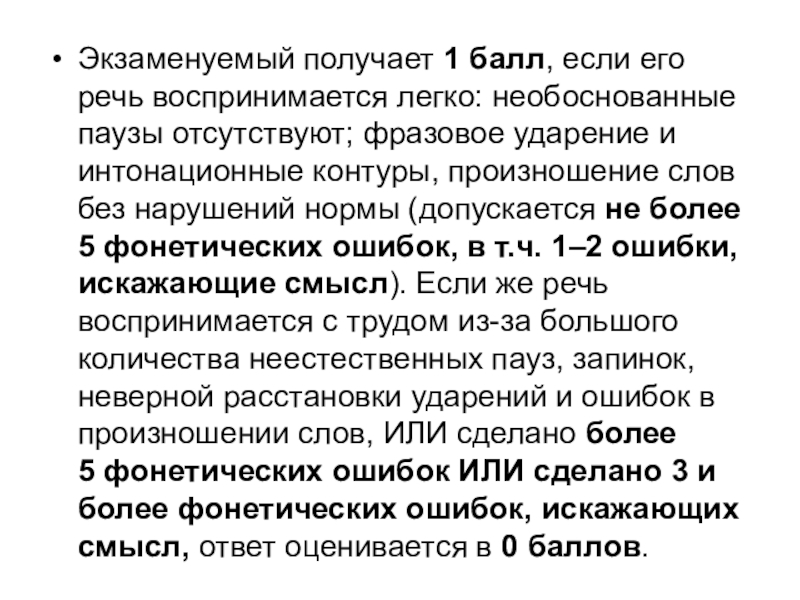 Слайд 9Экзаменуемый получает 1 балл, если его речь воспринимается легко: необоснованные паузы