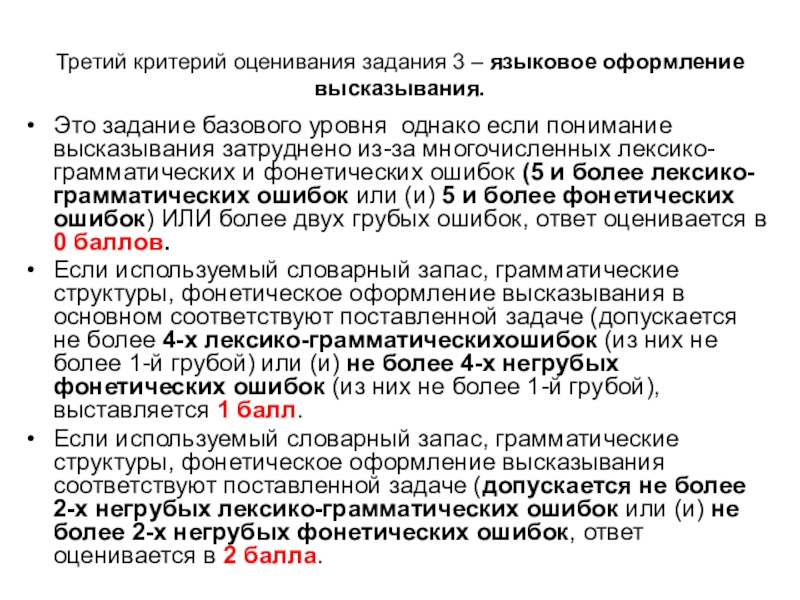 уровня однако если понимание высказывания затруднено из-за многочисленных лексико-грамматических и фонетических ошибок (5 и более лексико-грамматических ошибок или (и) 5 и более фонетических ошибок) ИЛИ более двух грубых ошибок, ответ оценивается в 0 баллов.