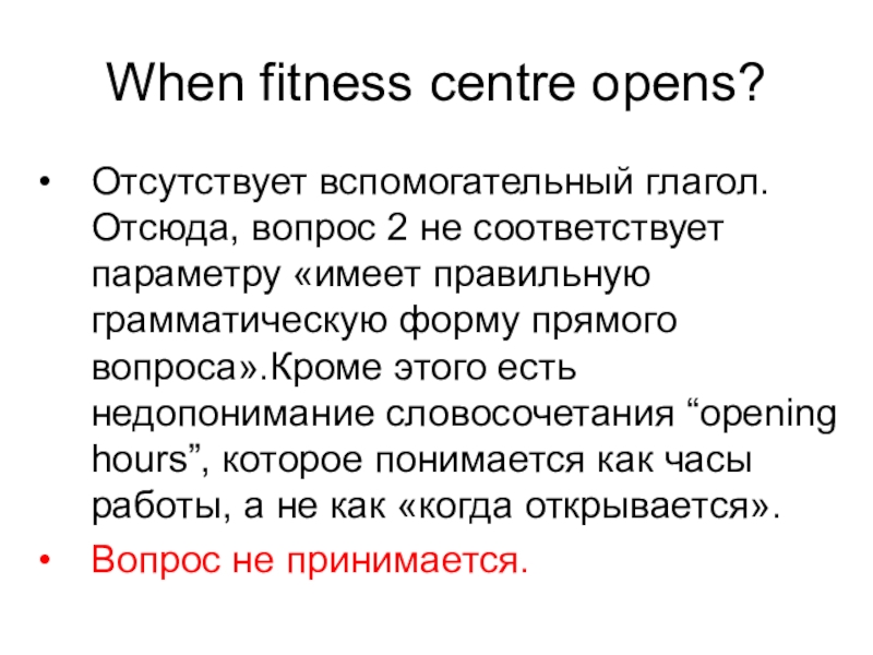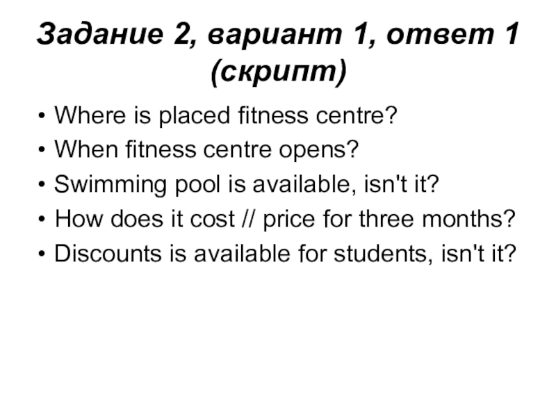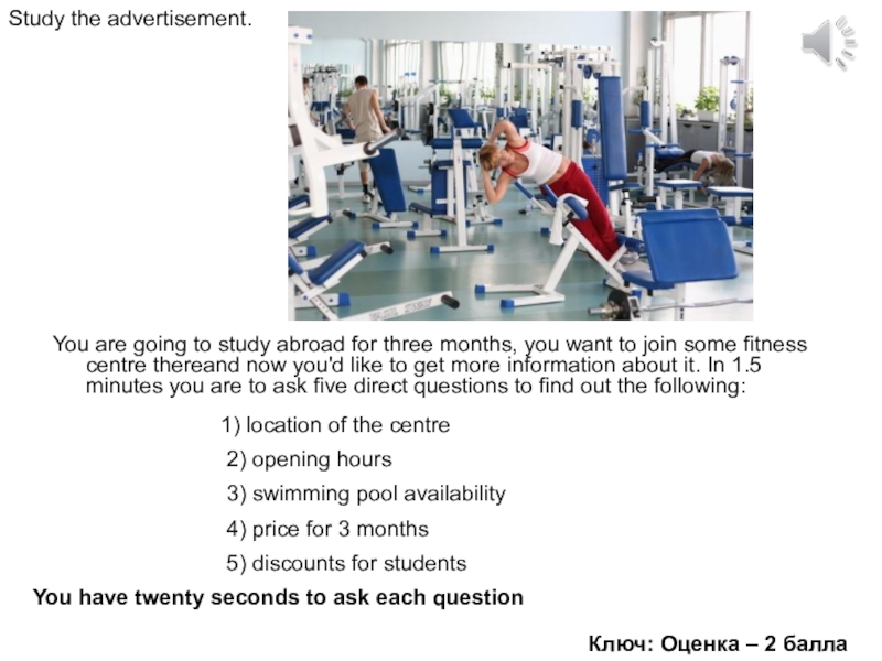 to join some fitness centre thereand now you'd like to get more information about it. In 1.5 minutes you are to ask five direct questions to find out the following: