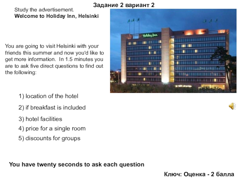 Максимально за правильное выполнение этого задания экзаменуемый может получить 5 баллов от экзаменуемого требуется ТОЛЬКО задать 5 вопросов по указанным содержательным аспектам. Этикетный диалог не включен в задание.