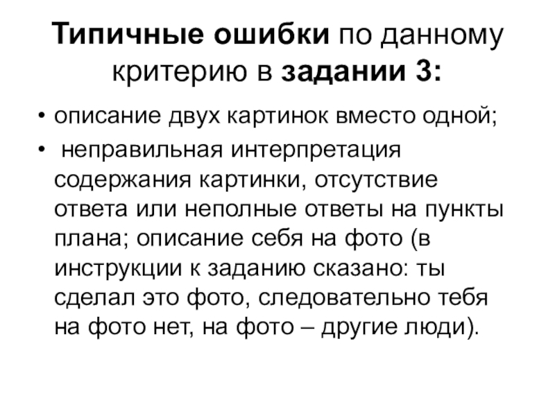 неправильная интерпретация содержания картинки, отсутствие ответа или неполные ответы на пункты плана; описание себя на фото (в инструкции к заданию сказано: ты сделал это фото, следовательно тебя на фото нет, на фото – другие люди).