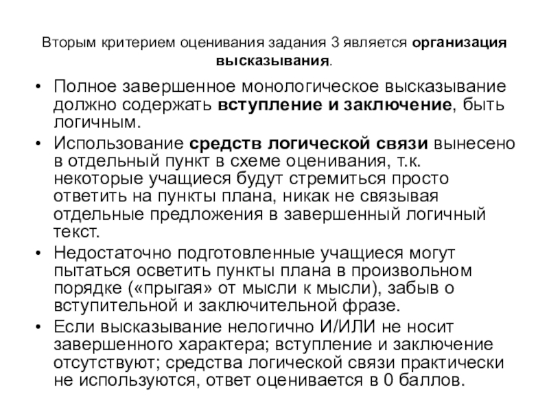 Слайд 41Вторым критерием оценивания задания 3 является организация высказывания.
