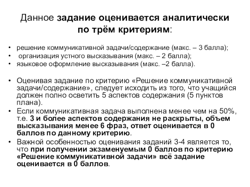 Важной особенностью оценивания заданий 3-4 является то, что при получении экзаменуемым 0 баллов по критерию «Решение коммуникативной задачи» всё задание оценивается в 0 баллов.