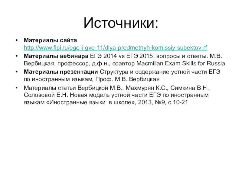 Материалы статьи Вербицкой М.В., Махмурян К.С., Симкина В.Н., Солововой Е.Н. Новая модель устной части ЕГЭ по иностранным языкам «Иностранные языки в школе», 2013, №9, с.10-21